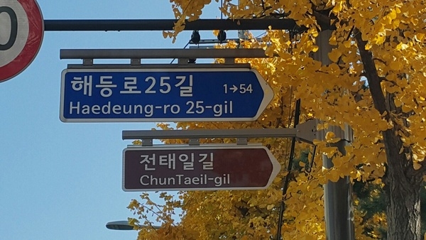 ‘전태일길(ChunTaeil-gil)’은 길이 279m 폭 15m로, 도로명주소 상 해등로25길 구간이다.