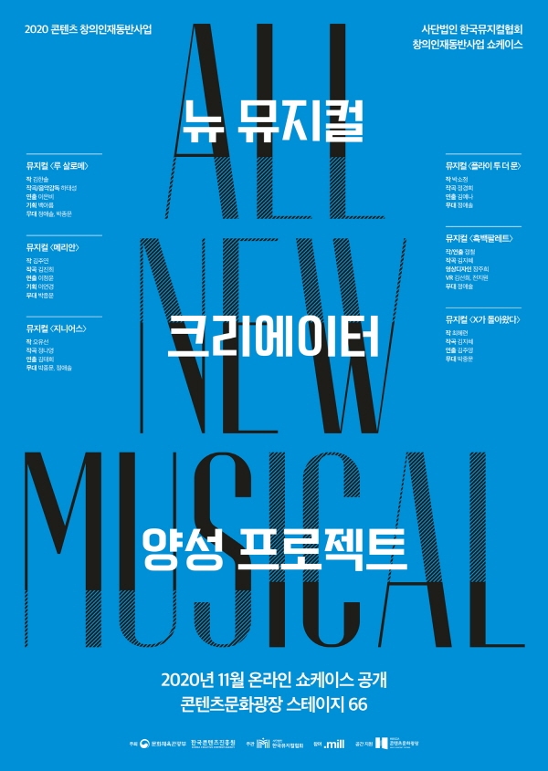 사단법인 한국뮤지컬협회(이사장 이유리)가 2020 콘텐츠 창의인재 동반사업 ‘뉴 뮤지컬 크리에이터 양성 프로젝트’의 쇼케이스 <ALL NEW MUSICAL>을 오는 11월 17일 한국뮤지컬협회 유튜브 공식채널을 통해 온라인 공개한다.