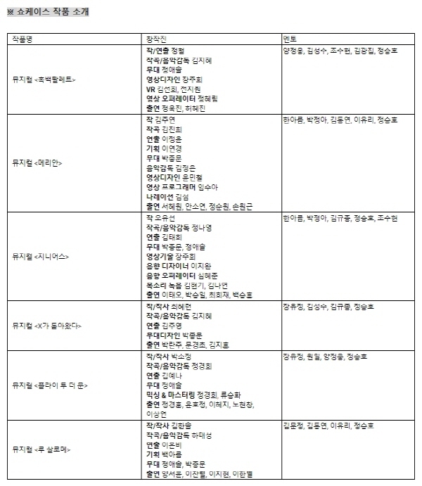이번 쇼케이스에서는 ‘뉴 뮤지컬 크리에이터 양성 프로젝트’의 멘티들이 팀을 이루어 직접 개발한 뮤지컬 <루 살로메>, <메리안>, <지니어스>, <플라이 투 더 문>, <흑백팔레트>, <X가 돌아왔다> 총 6개의 작품을 각 30분 가량의 분량으로 선보였다.