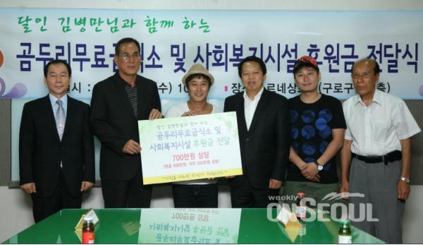 개그맨 김병만이 4일 구청 르네상스홀에서 장애인과 노인을 위한 복지에 써달라며 구로구 곰두리무료급식소에 후원금 500만원을 기탁했다. 후원금 전달식 후엔 다문화 아이들을 가르치는 지구촌학교와 장애인 복지시설 브니엘의 집을 방문해 치킨 150마리를 전달하는 위문행사도 가졌다.